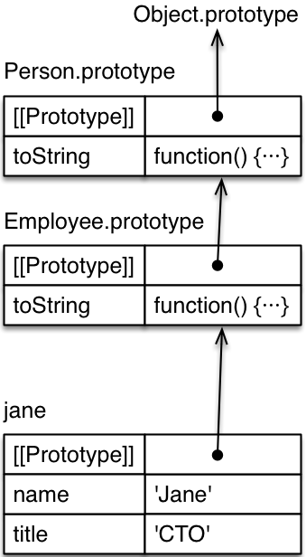The object diagram for this class declaration looks as follows. Tip for understanding it: [[Prototype]] is an inheritance relationship between objects, while prototype is a normal property whose value is an object. The property prototype is only special w.r.t. the new operator using its value as the prototype for instances it creates.