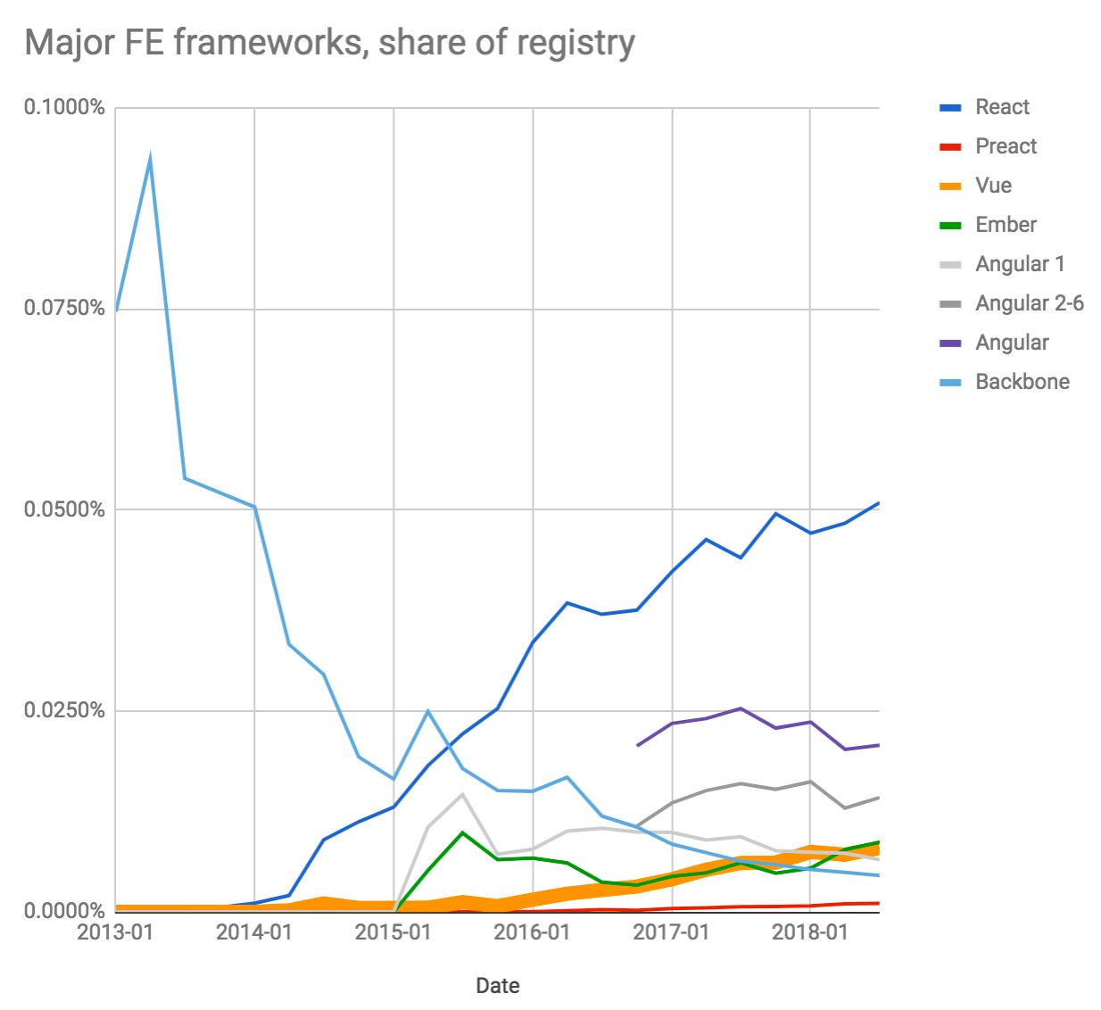 Vue was already growing quickly and that continued in 2018. Many Vue users report that they picked it over React because in their opinion it’s easier to get started while maintaining extensibility. Our current theory is that React’s growth has been slowed by many newer users picking Vue.